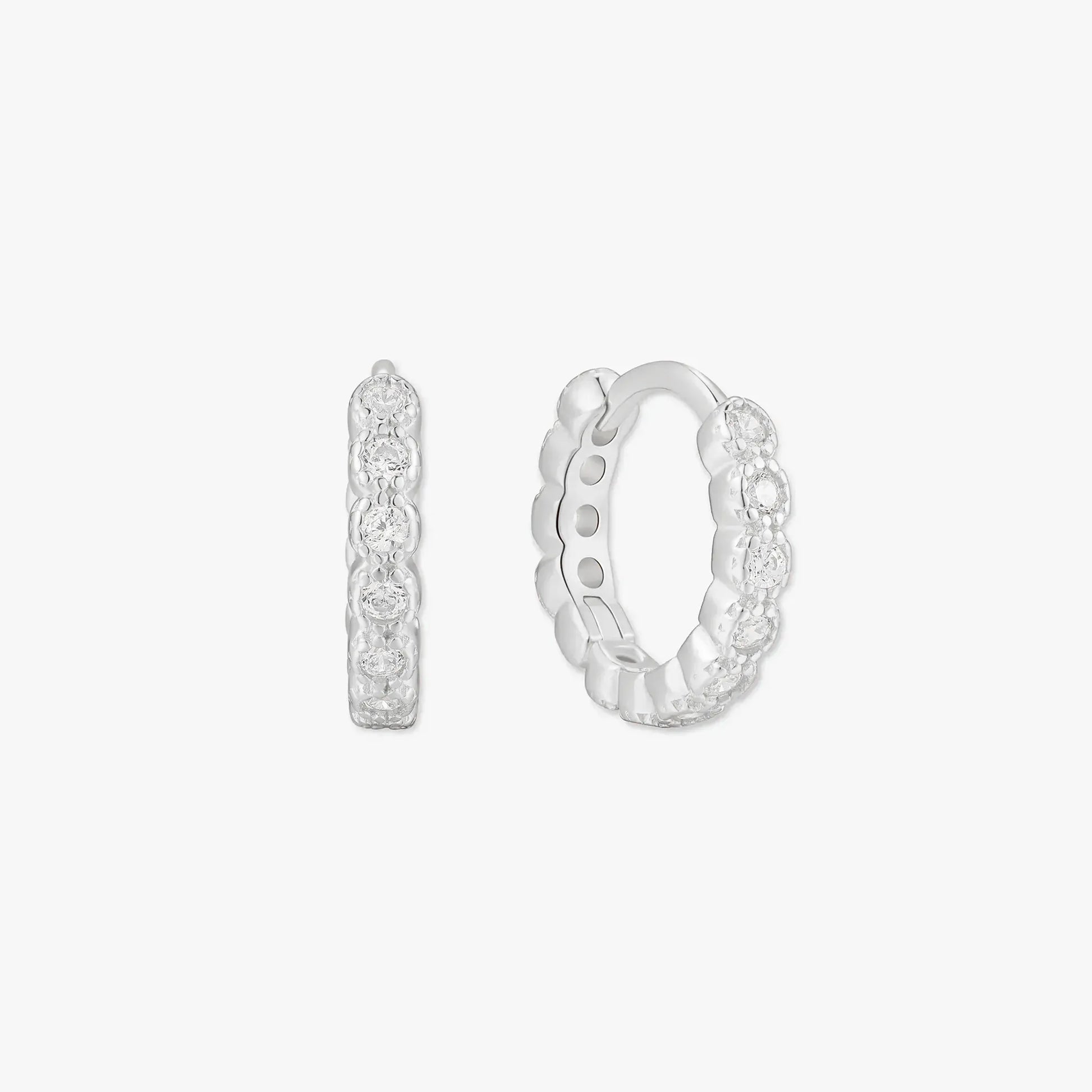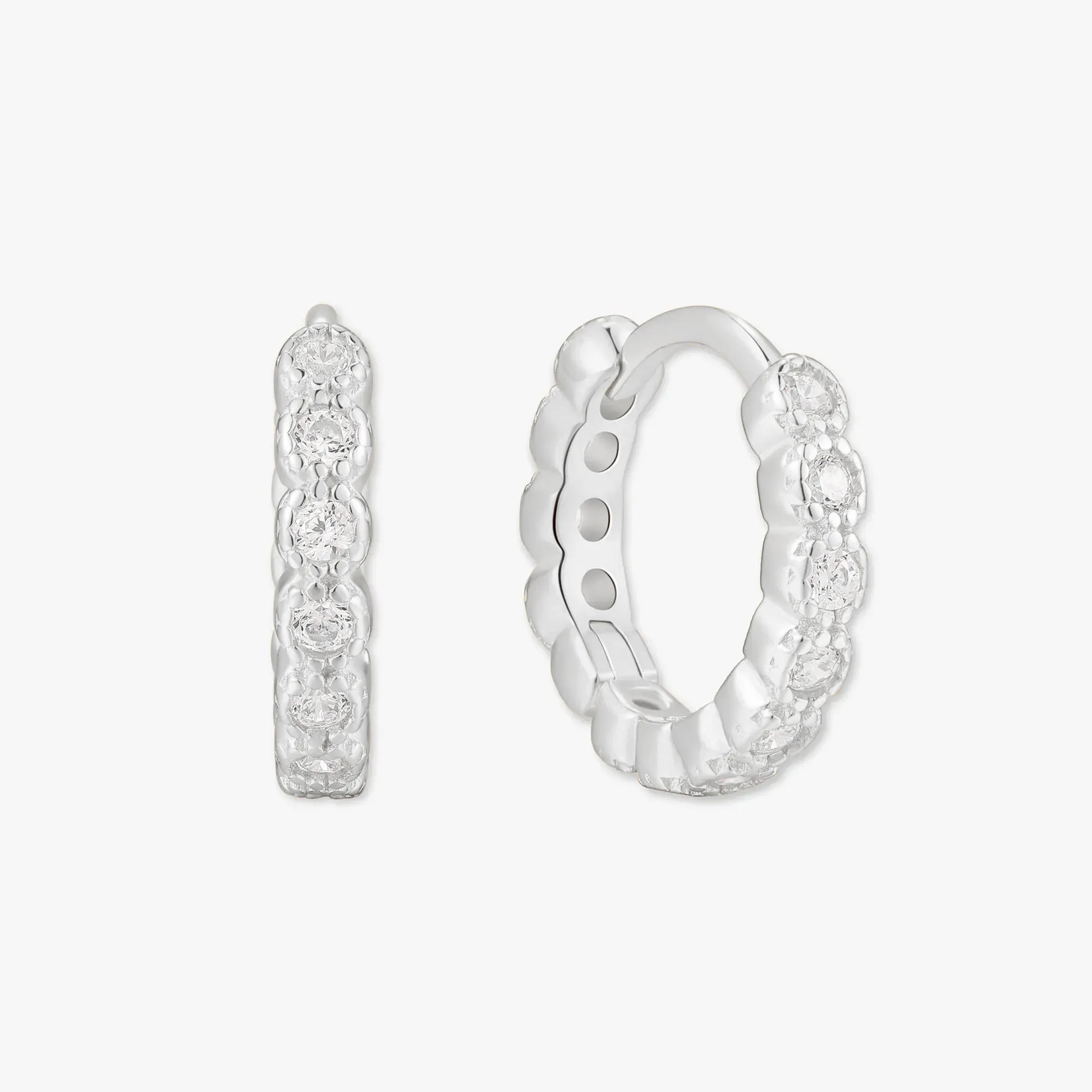 Our Silver Textured Crystal Huggie Hoops combine vintage charm with modern sparkle. Featuring a delicate row of crystals and a unique textured finish, these hoops are lightweight, elegant, and perfect for stacking or wearing solo to elevate your look.