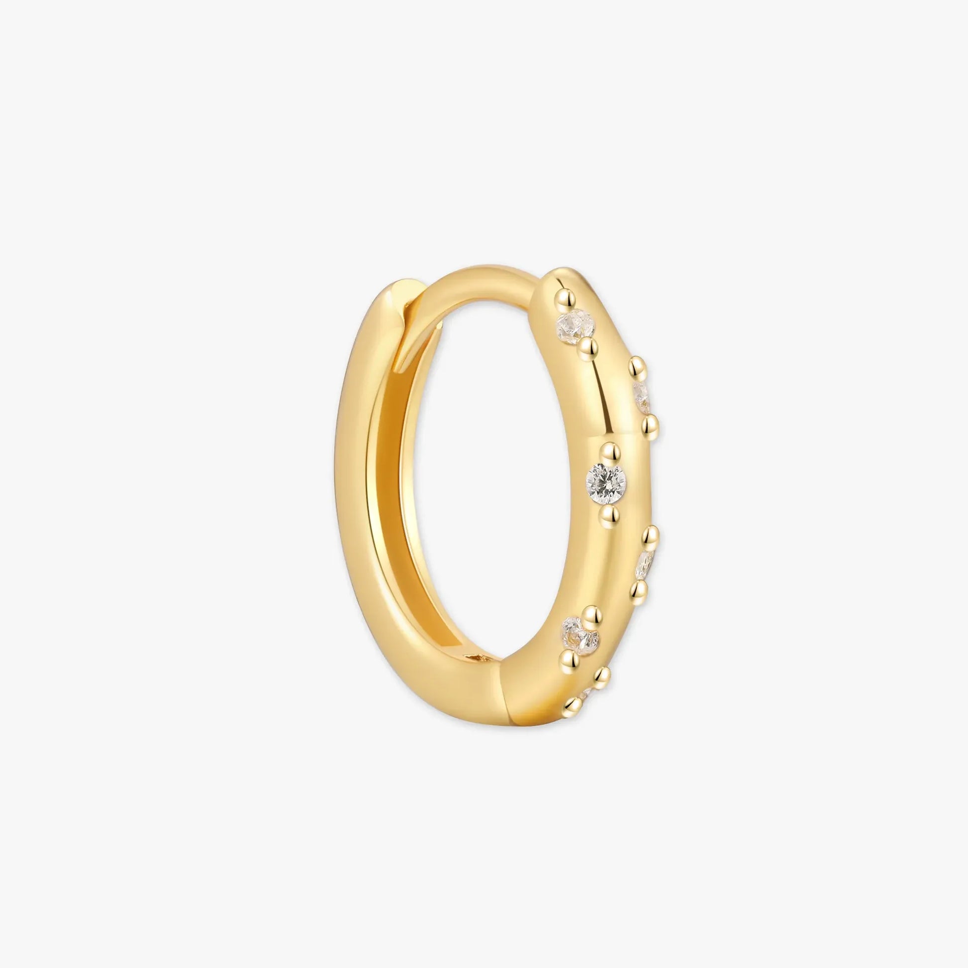 Our Gold Crystal Dotted Huggie Hoops feature a smooth, polished finish adorned with delicate crystal accents. Perfect for adding a subtle sparkle to your everyday look, these lightweight hoops are ideal for stacking or wearing solo.