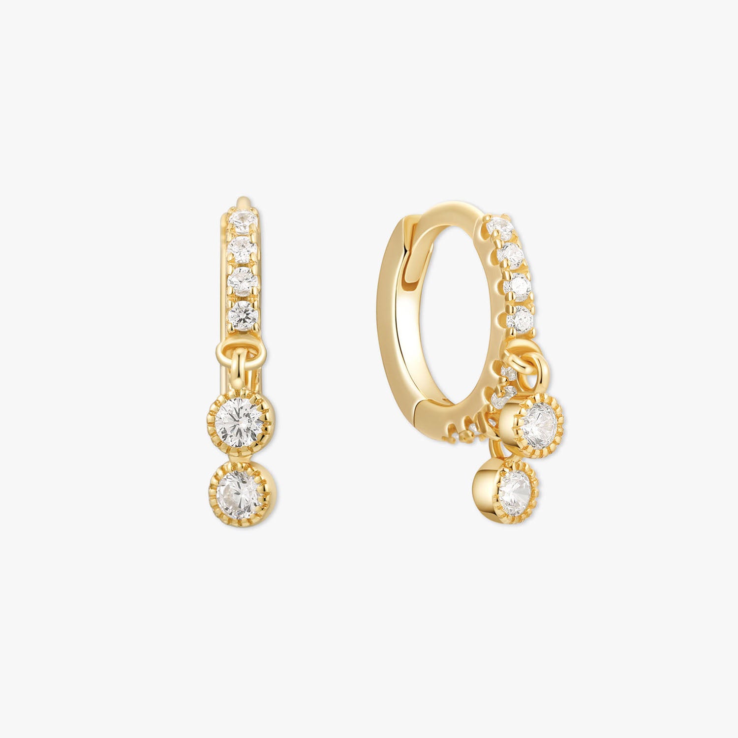 A little movement, a lot of sparkle. This gold-plated huggie is crafted in 925 sterling silver and pavé-set along the front, finished with two bezel CZ drops that sway with every step. Hypoallergenic and nickel-free with a secure click-huggie closure, it’s lightweight, easy to wear, and made to stack with your everyday favourites.