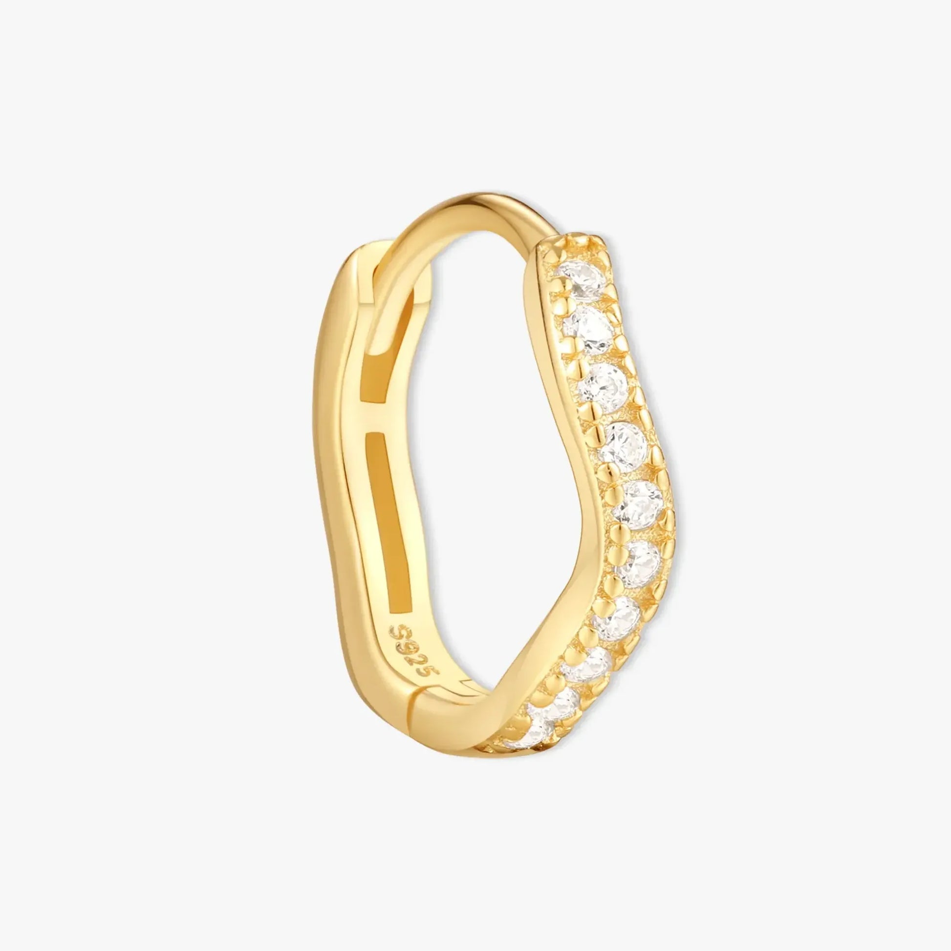 Our Gold Wavy Crystal Huggie Hoops bring a unique twist to classic hoops. Featuring a soft wave design adorned with shimmering crystals, these hoops add effortless sparkle and style. Perfect for stacking or wearing solo for a modern, elegant look.